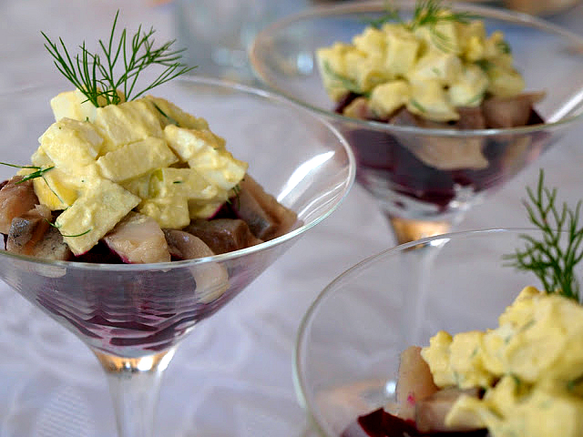 At this point all the ingredients are ready, time to bring it all together! Prepare the dishes (preferably small glasses) place in the following order: beets, herring, egg mix. Try to make all the portions similar. Finally add some dill on top and your delicious salad is ready!